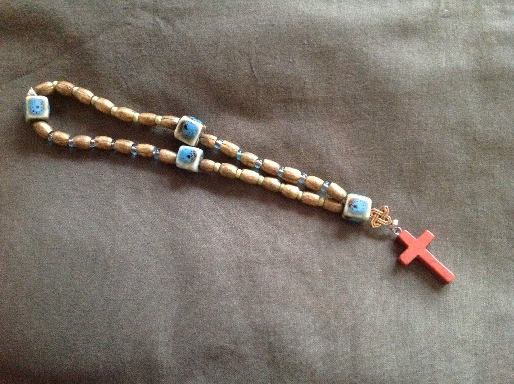 I made my first prayer beads that year from bronzed metal beads that June had recovered from a necklace bought during some of her travels, along with four lovely ceramic cruciform beads which my fingers were drawn to slide over. I selected a simple and lovely wooden cross, then a Celtic knot as my invitatory bead. I decided on natural fiber to string them together. My own prayers, the longing and grateful thoughts of my heart, began to slip between each bead as the circle took shape. I held them in my hand when I was finished, taking in with the beads the stories shared with my faith community that had been a part of their emergence. These beads have been my companion ever since, and a daily practice of contemplative prayer began to emerge for me. Most recently, my prayer beads accompanied me on a prayerful weekend retreat where they were my touchstone of faith in community as my own vocational path and spiritual journey grows and emerges, step by step and day by day.