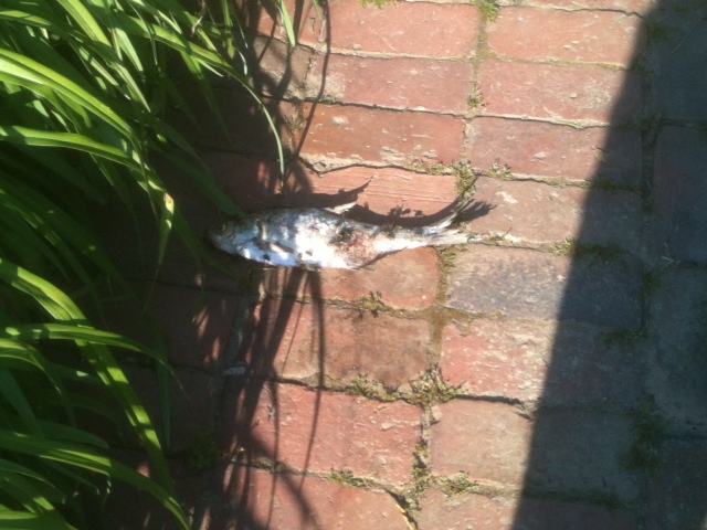 Last year…May 14, 2013 according to my email…Tyler, who had been singing with me in my choir, sent me a picture of a fish laying in the middle of his city garden.  His wife had snapped a photo of this oddity, and they supposed it was a bird of prey that had inadvertently dropped its lunch somewhere between the James River and wherever its nesting grounds were.  Tyler sent this photo to two of us in the choir, and our two remaining clergy at that time which was shortly after our Rector had retired.  In his email, he wrote, I am taking this as a sign that the transition at St. Thomas will turn out well.”
