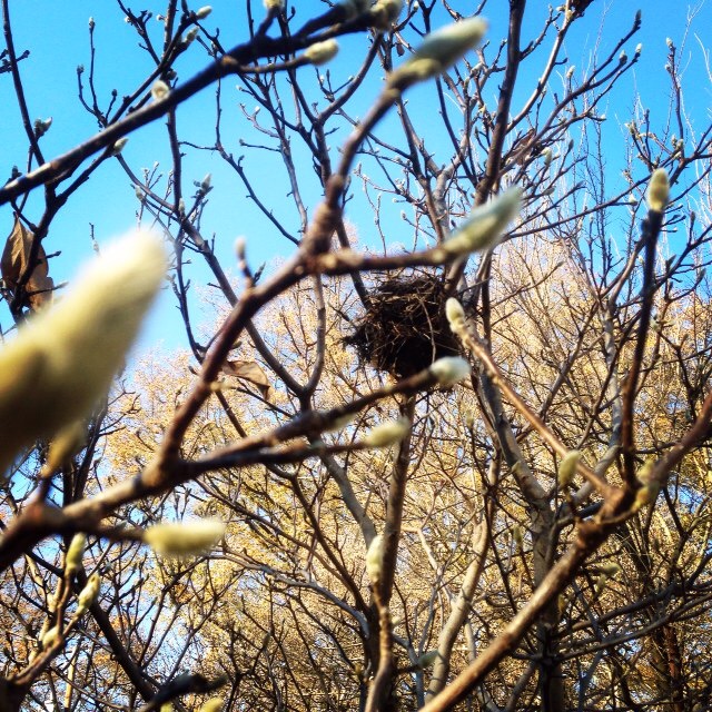 Today, something else caught my attention, though. I was kneeling beneath my magnolia, putting in a few crocus into the dirt around the tree trunk. When I looked up, I first noticed the wonderful furry coats the magnolia blossoms had all donned for winter. My tree looked like it was full of pussy-willow branches. How ingenious is nature, devising exactly the right kind of protection as winter approaches to protect the springtime blooms. Then, through the branches, I saw a sturdy, well-constructed nest that held a family of birds. It was secure and would inevitably keep its occupants clear of cold and snow until it was safe to return and emerge into spring.