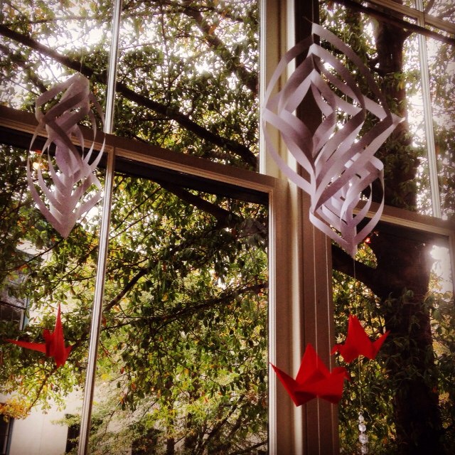 Every time I glanced up at the large windows flanking our breakfast gathering, I saw these graceful paper cranes dangling, mid-flight, from complex paper cuttings. Prosperity, simplicity, complexity, soaring, suspended, independent, together…these cranes told a story in paper that seemed to mirror this group gathered in spirit over coffee. They reminded me of how I thrive in the midst of complex intellectual curiosity and the simple authenticity of human connection. I was grateful to feel it, to experience that moment of heaven on earth when we are seen and known and jointly living, thriving, being in common communion together.