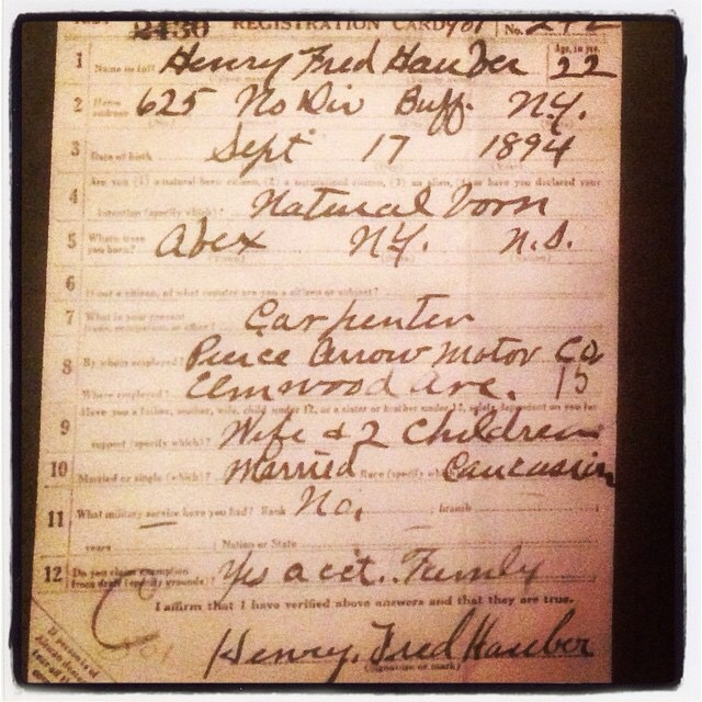 Every visit, I learn something new about this family that raised me. This time, an unexpected gift came in the form of historical records about my great-grandfather, Henry Hauber. My mother had received a letter in the mail after visiting the Pierce Arrow car museum in Buffalo where she signed the guest register and penned a note that she was related to a former employee, Henry Hauber. Unexpectedly, the museum contacted her a few weeks ago with a copy of his draft registration card from World War I.