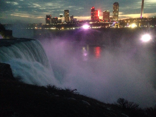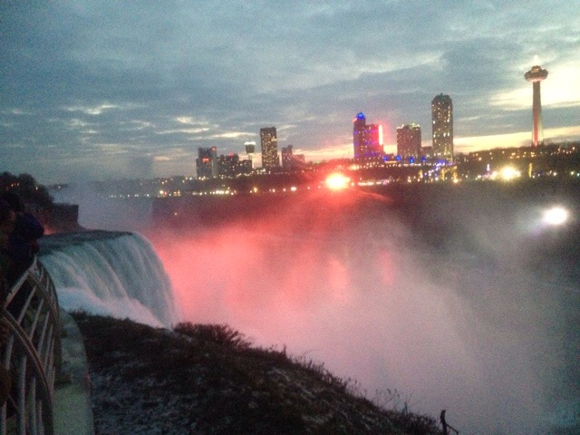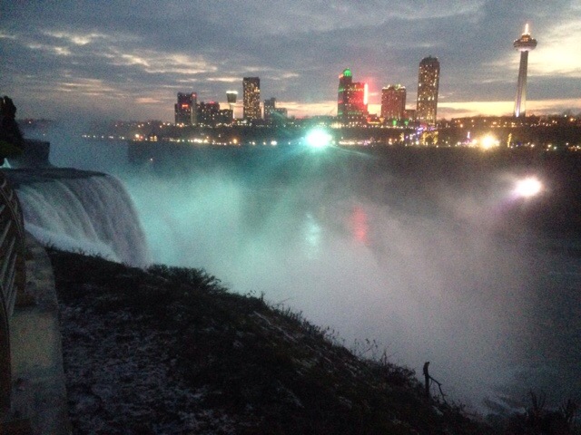 My daughter, who had been dragging her feet, suddenly sprang to life and brought out the 35mm camera she has been learning to use. She started testing out settings, lighting, lenses. This was the perfect place to experiment. A dozen or so other people…not hundreds…were gathered by the edge of Niagara Falls waiting in hopes of an illumination. It was past 5 p.m. and dusk was becoming dark. The sky was majestic with winter clouds as the sun dipped low into the horizon. At that moment, the illumination emerged full force from the Canadian side, creating billowing mist clouds: